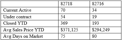For the 82716 zip code, there are 34 active listings and 19 homes under contract. Year to date, 193 homes have sold, with an average of 80 days on the market.